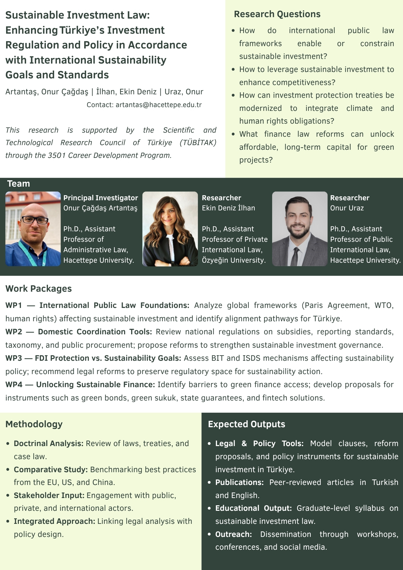 The project, which also aims to lay the groundwork for making investment law compatible with the green transition, is led by Dr. Onur Çağdaş Artantaş. The project team includes Dr. Onur Uraz, Assistant Professor at Hacettepe University Faculty of Law, and Dr. Ekin Deniz İlhan, Assistant Professor at Özyeğin University Faculty of Law, as researchers; and Research Assistant Tarık Kıroğlu and Research Assistant Beyza Aktaş from Hacettepe University Faculty of Law as fellows.