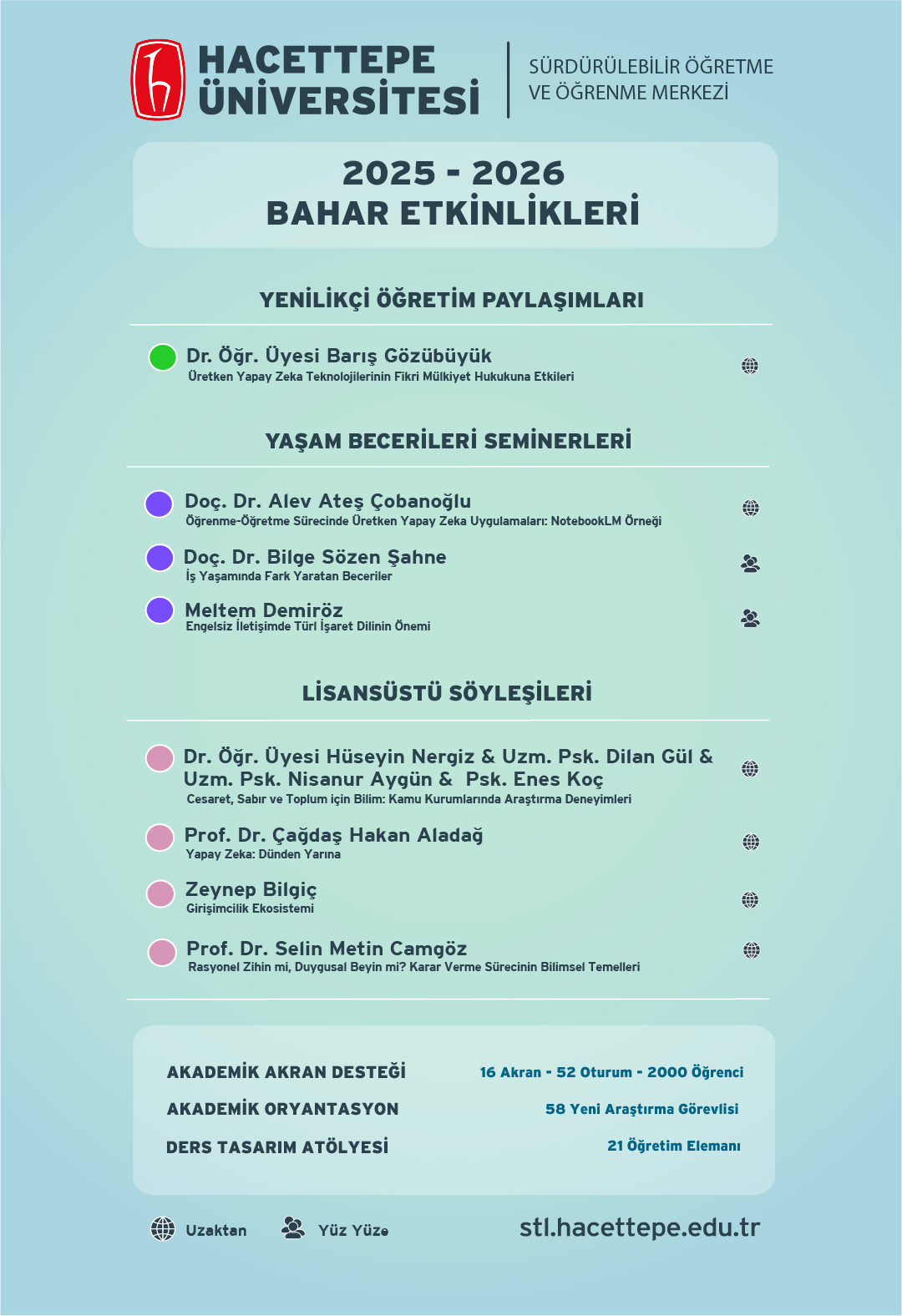 The Center for Sustainable Teaching and Learning brings evidence-based, inclusive, sustainable learning and teaching practices to Hacettepe University through its activities. The Center reached 210 faculty members and 2,161 students through its activities in the past term. Seminars organized by the Center covered topics such as Instructional Gamification, Education in the Age of Generative and Agentic Artificial Intelligence, Artificial Intelligence Avatar Videos: Pedagogical Effects and Applications, Entrepreneurship for Everyone, and The Replication Crisis in Social Sciences and Education Research: Problems and Solutions.